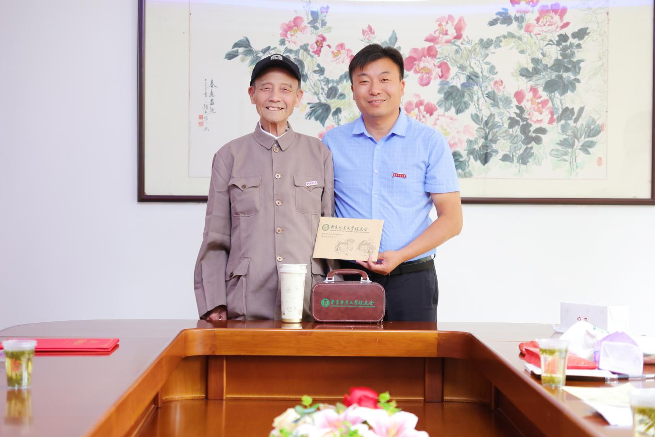 施永钧在交流后郑重地将一份饱含深情的"礼物"交到母校人员手中:沉甸甸的2万元捐款、读书期间获得的数枚运动员奖章和证件、更有他亲笔整理写下的《回忆我的大学生活》、《各种树木花卉的内在寓意》、《慈母家训》等数篇文章,刘子超主任和唐萍书记代表学校,向校友颁发捐赠证书,并回赠了刻有南林印记的纪念品。场面其乐融融、温情满满。