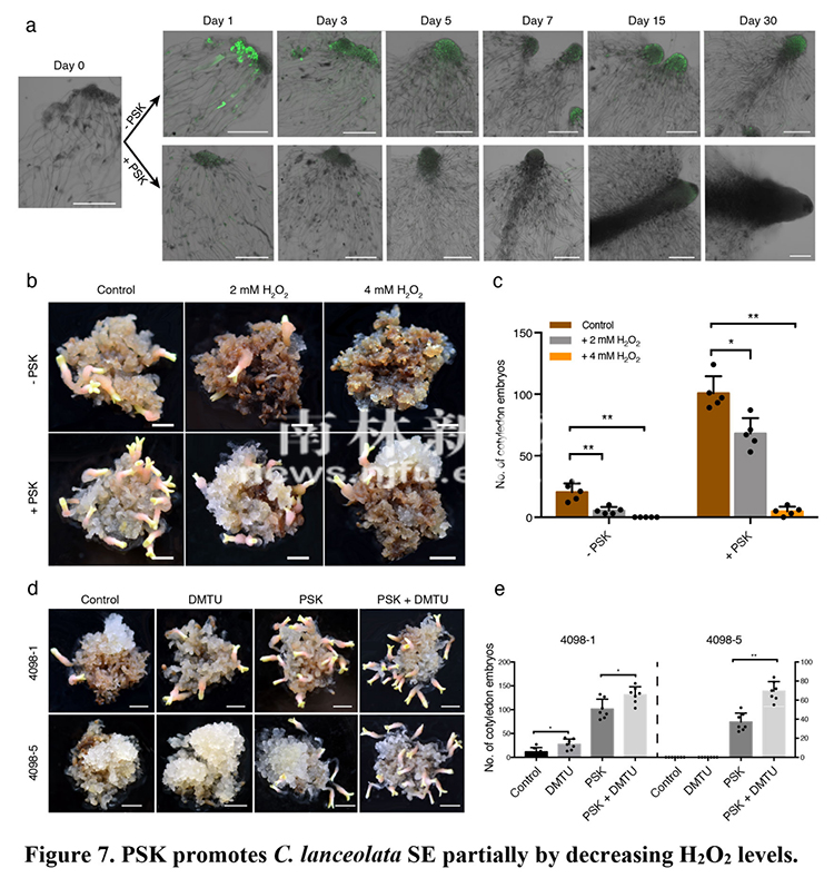 通过褐化表型鉴定、DCF和DAB染色以及H2O2含量测定,研究发现PSK处理能够在体胚诱导早期降低PRXs转录活性,维持活性氧内稳态,提升WOX2等体胚发生相关基因的表达,最终促进杉木的体胚发生。进一步的研究表明,H2O2水平的降低是PSK介导的顽拗型杉木体胚发生的必要不充分条件。研究还通过对杉木PSK编码基因ClPSK的克隆及在拟南芥中的异源过表达,发现其确实能够增强拟南芥的体胚发生以及对H2O2胁迫的抗性。