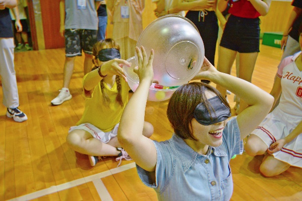 高潮过后迎来了第三个游戏:“运球帷幄”。游戏规则是每队选4个人,每个人需要蒙上眼罩,从第一个人开始把球倒在后一个人头上顶着的大碗里,直至到最后一个人,比赛成绩通过最后一个人碗中剩余小球的数量计算,剩余越多则得分越高。该游戏较前两项运动量稍小,考验的是队员之间的默契和感觉。