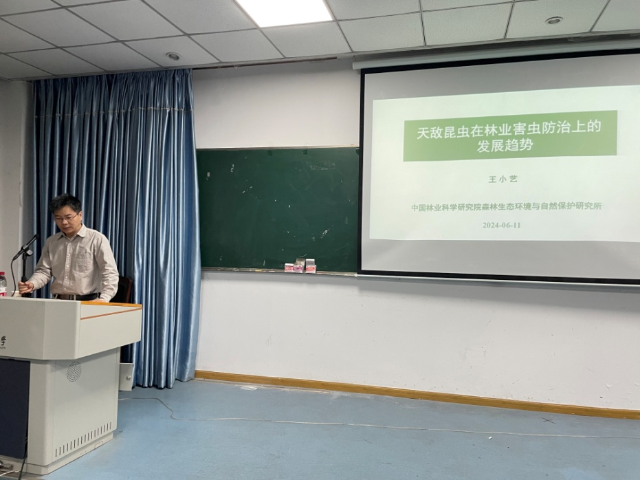 6月11日上午,中国林科院森林生态环境与自然保护研究所副所长王小艺研究员应邀来成人a片 作题为"天敌昆虫在林业害虫防治上的发展趋势"的学术讲座。此次讲座作为"森保大家谈"系列活动的第十一讲,由森保系系主任郝德君教授主持,吸引了众多师生前来聆听。