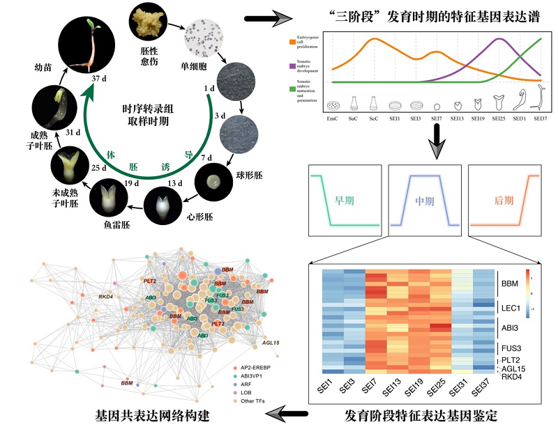 图1. 杂交鹅掌楸体胚发生时序转录图谱及表达调控网络