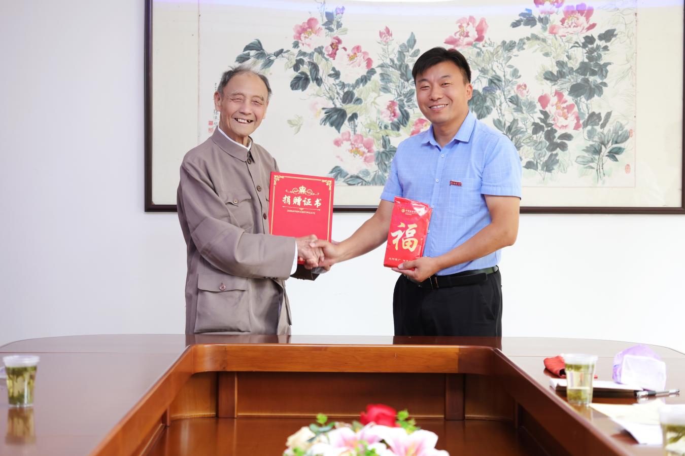 施永钧在交流后郑重地将一份饱含深情的"礼物"交到母校人员手中:沉甸甸的2万元捐款、读书期间获得的数枚运动员奖章和证件、更有他亲笔整理写下的《回忆我的大学生活》、《各种树木花卉的内在寓意》、《慈母家训》等数篇文章,刘子超主任和唐萍书记代表学校,向校友颁发捐赠证书,并回赠了刻有南林印记的纪念品。场面其乐融融、温情满满。