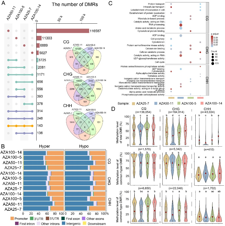 运用亲子代分型(trio-binning)策略,研究团队成功组装了杨树NL895的两套单倍型基因组。其中母本单倍型基因组大小为399.39 Mb,父本单倍型基因组大小为400.52 Mb,组装完整度均达到97%以上。基于该高质量参考基因组,研究人员对表观突变体进行了全基因组DNA甲基化分析。结果显示,所有表观突变体的DNA甲基化在全基因组水平都有所下降;表观突变体之间,差异甲基化区域(DMRs)在数量、基因功能元件分布、以及重叠基因的功能等方面都呈现高度的多样性(图2),表明5-Aza处理产生的表观突变体在DNA甲基化修饰变异上具有显著随机性。